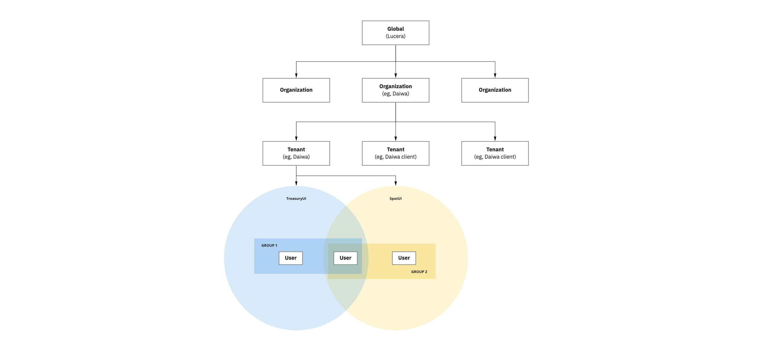Diagram of Organization, Tenat, Group, and User hierarchy.