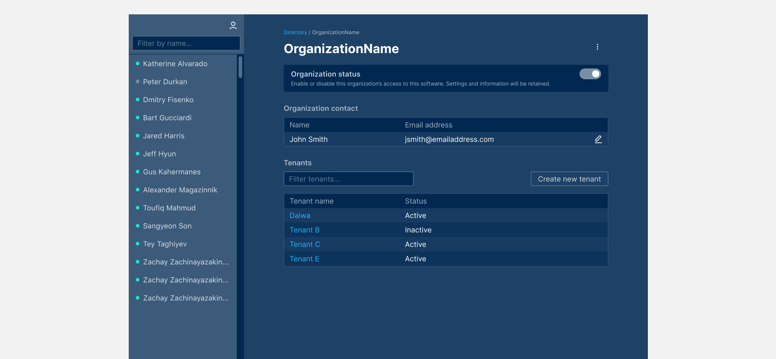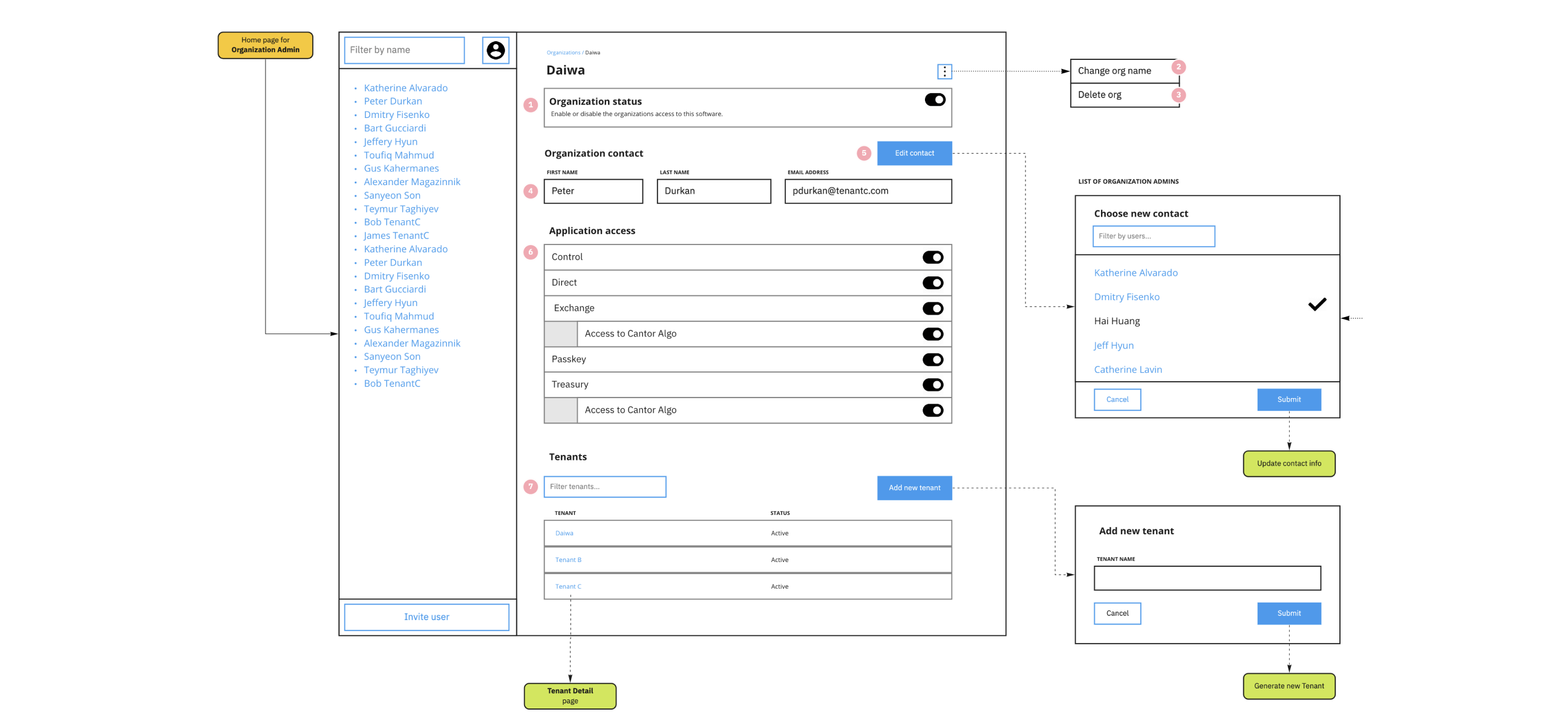Admins on the organization page could enable or disable an organization’s access to applications, create tenants for whitelisting, and invite users.