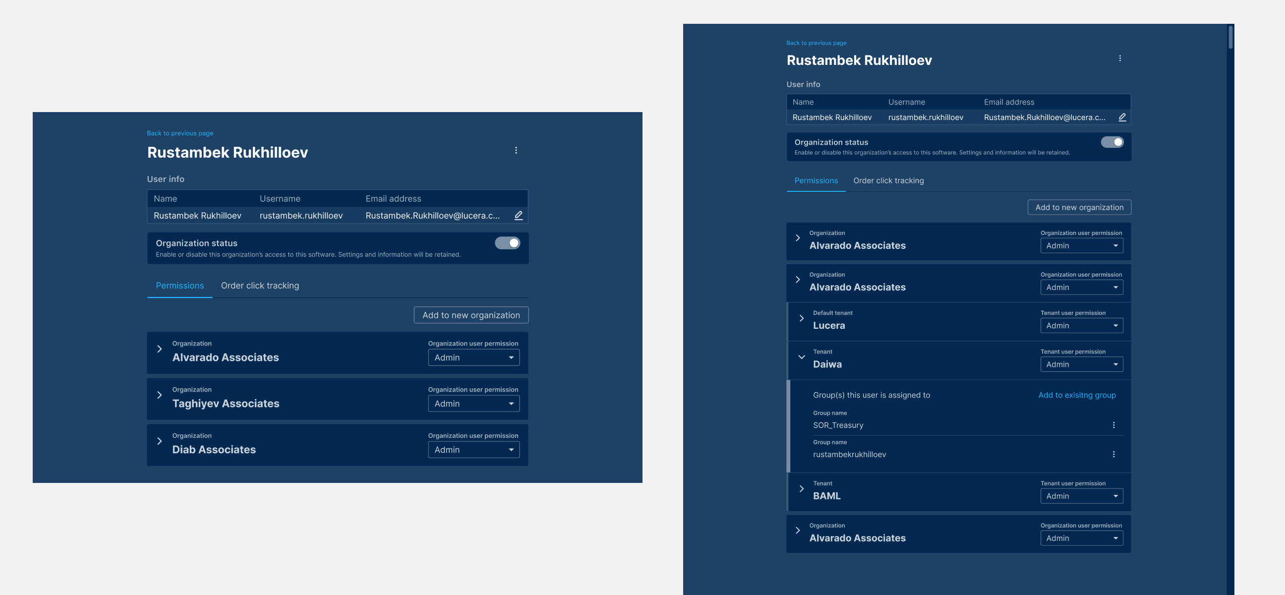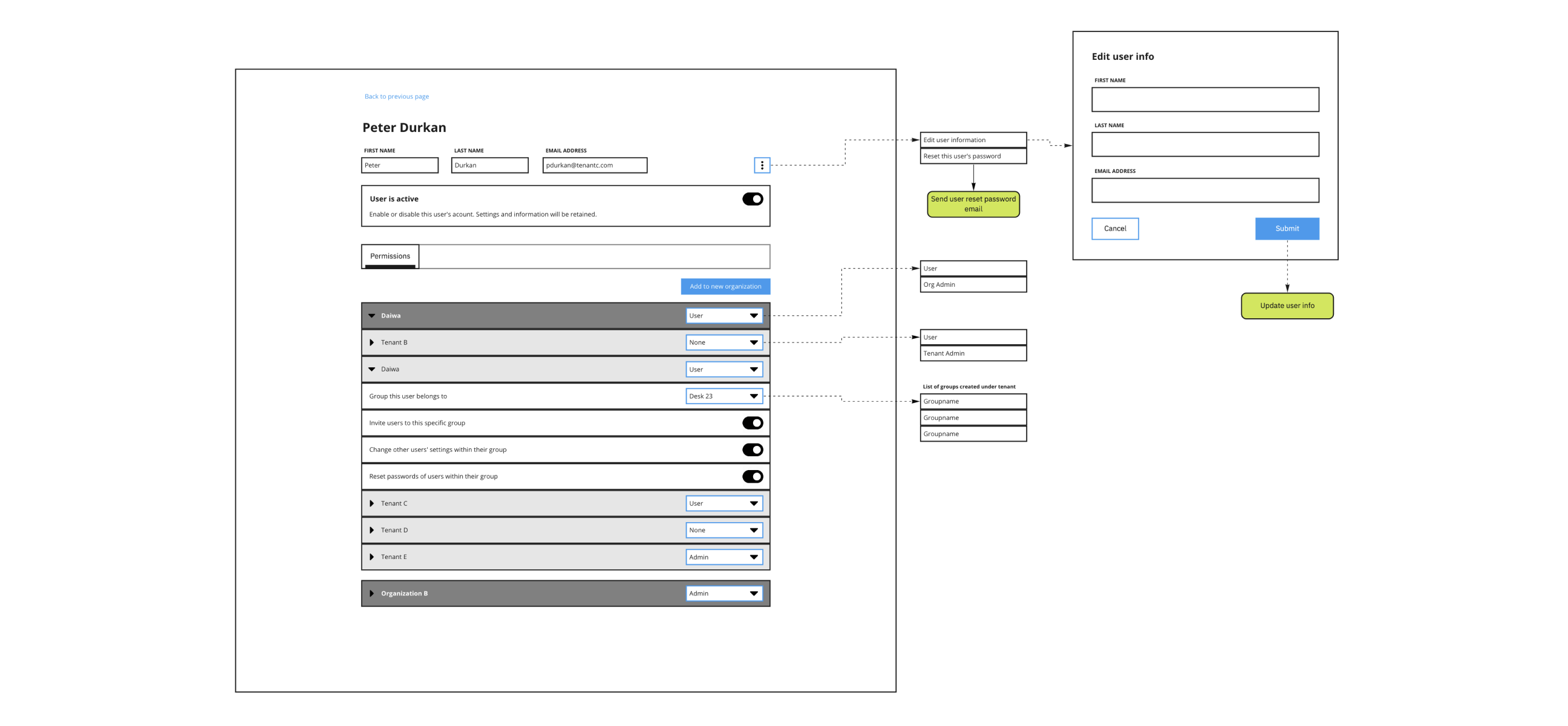 On the user detail page, Admins could add, edit, or remove the organization, tenant, or group a user was assigned to.